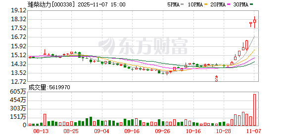证券时报·数据宝统计显示,潍柴动力今日收盘价为18.27元,上涨1.33%,日换手率为11.27%,成交额为101.08亿元,全天主力资金净流出4.25亿元,近5日该股累计上涨22.13%,近5日资金合计净流入5.60亿元。